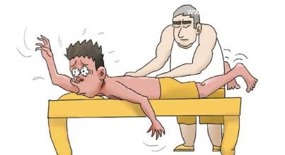 3. 患者站立,弯腰扶住床边。医生站在患者的侧后方,一手扶住患者的腹部,另一手扶住患者的腰部,两手相对用力,环旋摇动患者的腰部,并使其摇动的范围逐渐加大,约2-3分钟。