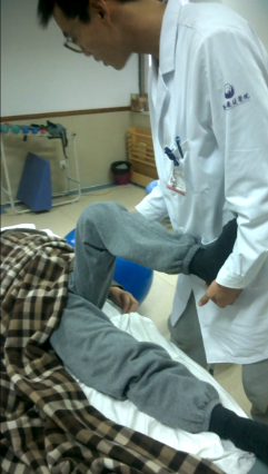 4.关节活动度:患侧上下肢被动活动正常,主动活动时:髋屈50°、伸10°;膝屈10°、伸60°