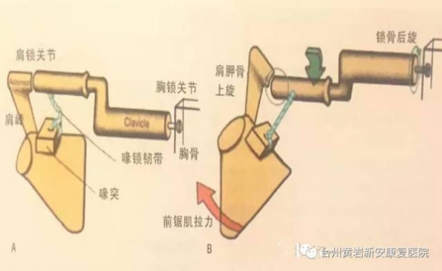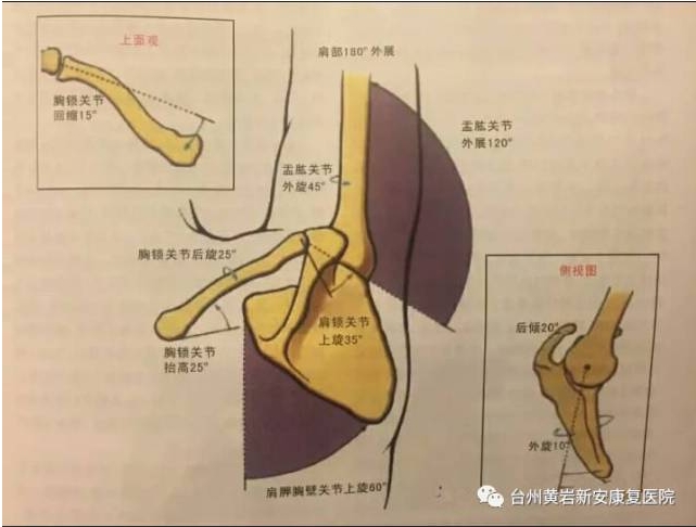 肩完全外展时,肩胛骨向后倾斜,并向外旋转(倾斜及旋转的总量各异,主要依据肩锁关节及胸锁关节的联合运动而定)