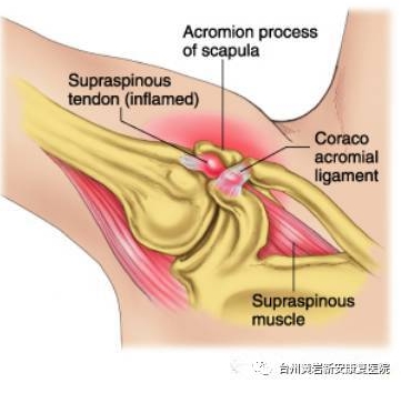 不正常的被动活动损伤肩周软组织(大部分是肩袖软组织结构被挤压在喙突肩峰弓与肱骨头之间而受到反复的撞击和拉伸)